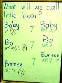 In the afternoon we voted for a name. Baby, Bo and Barney won with 3 votes each – a tie. It was down to Baby, Bo or Barney. We voted again – this time by secret ballot. The children went to different parts of the room, wrote the name they wanted for the bear on a piece of paper, folded it and placed it in the box I was holding. The result – 7 votes each! Our bear was still unnamed. One child said, “We could vote again.” So we did – once again, by secret ballot (more meaningful writing and numeracy).