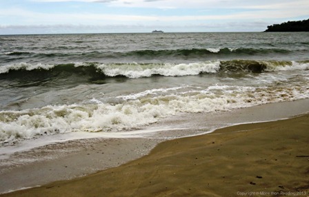 Children read their names as they choose from two groups of 25 sticky-backed name tags spread on separate tables: one name tag goes on their shirts for identification and one labels his/her backpack spot on the shelves.