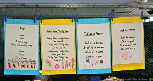Using a metre-stick, I point to the words on a big, rhyme chart and read: Jump, jump, jump all day… Children jump and act out the rhyme. Those who can read, join in. The class reads and moves to all four rhyme charts: Jump, Teddy Bear, Teddy Bear, Tall as a House and Jack be Nimble.
